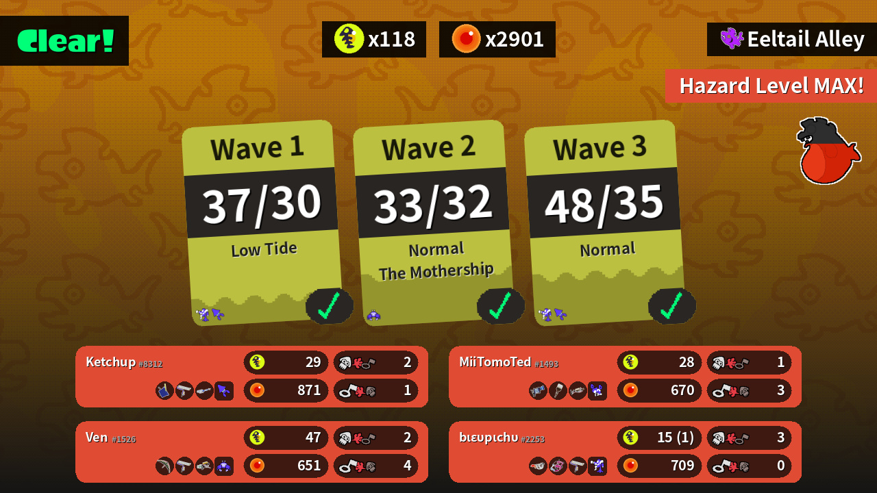 | Weapons | Tri-Slosher Splat Roller E-liter 4K | Tenta Brella Splat Roller Grizzco Blaster | L-3 Nozzlenose Octobrush Grizzco Charger | Goo Tuber Dapple Dualies Splat Roller |
