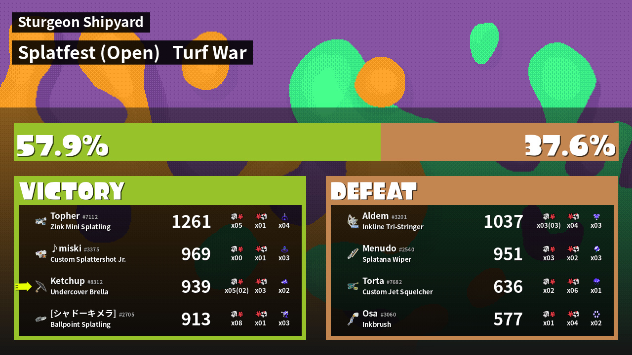 | Medals | #1 Enemy-Base Inker #1 Splat Assister #1 Ground Traveler | ||
