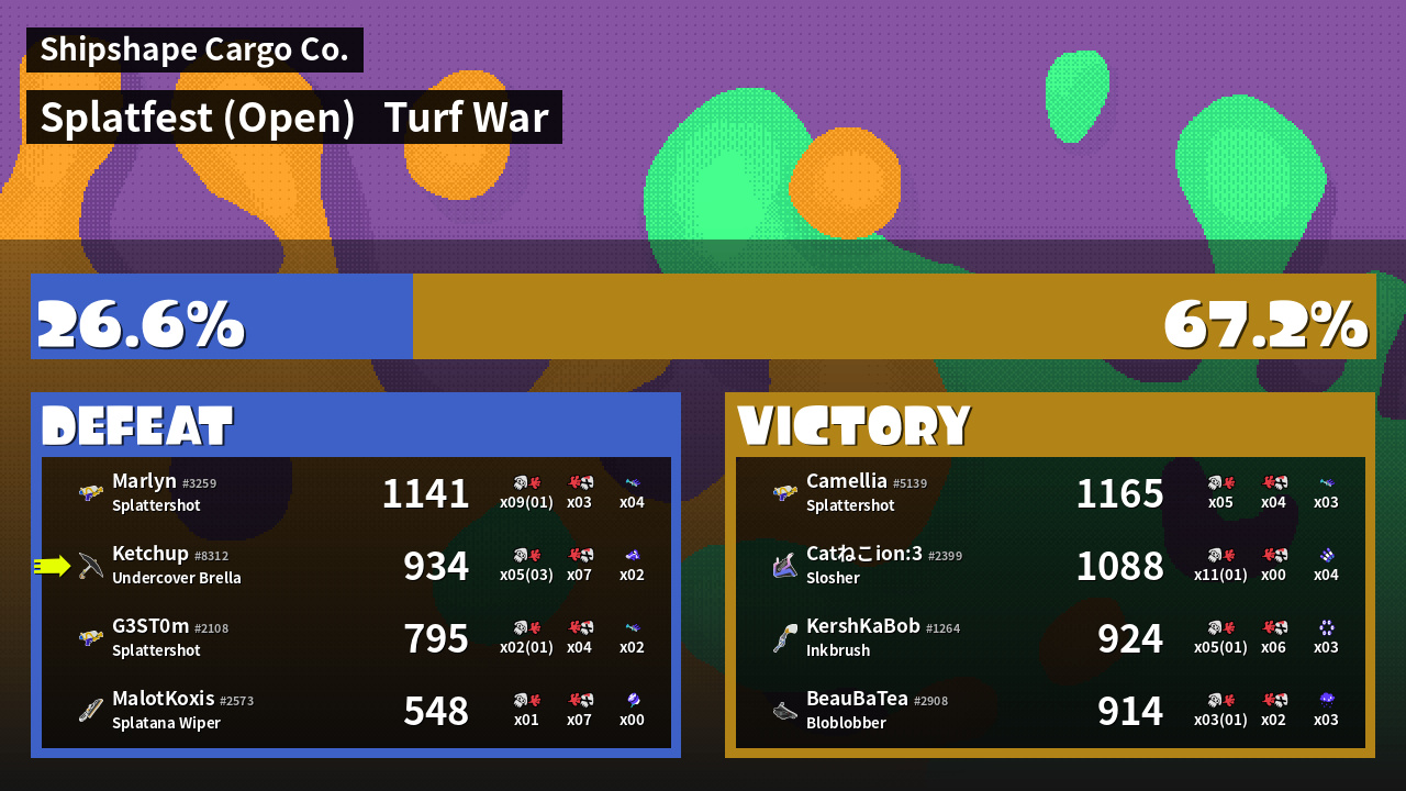 | Medals | #1 Enemy-Base Inker #1 Splat Assister #1 Ground Traveler | ||
