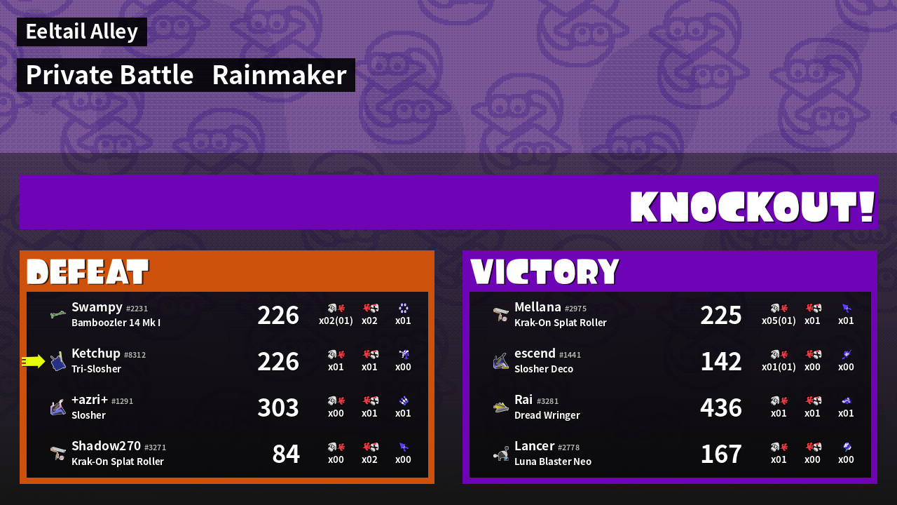 | Medals | #1 Enemy Splatter #1 Ink Consumer #2 Overall Splatter | ||