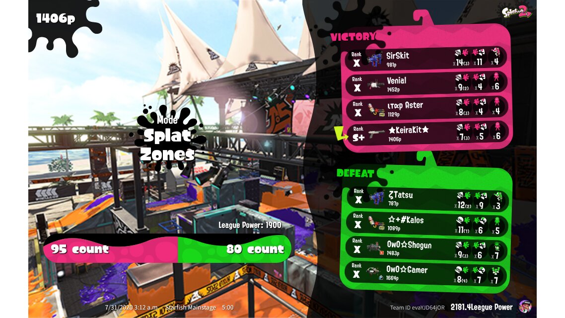 | Mode | Splat Zones - League Battle (Quad) | ||||||||||||||||