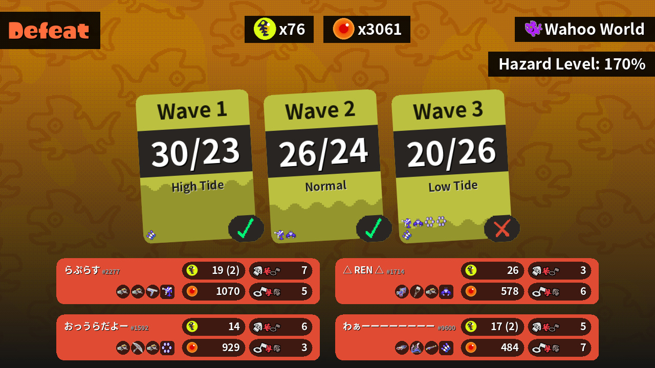 | Weapons | Grizzco Blaster Grizzco Blaster Big Swig Roller | Glooga Dualies Octobrush Grizzco Blaster | Splattershot Pro Slosher Splat Charger | Grizzco Blaster Splat Brella Grizzco Blaster |