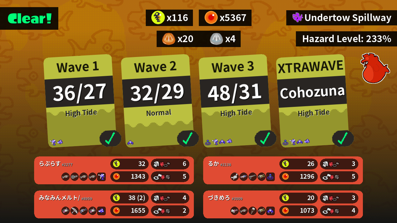 | Weapons | Grizzco Charger Nautilus 47 Grizzco Charger Grizzco Charger | .52 Gal Splat Brella H-3 Nozzlenose .52 Gal | Luna Blaster Splattershot Pro N-ZAP '85 Sploosh-o-matic | Heavy Splatling Grizzco Charger Octobrush Sploosh-o-matic |