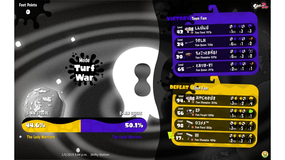 | Splatfest Title | Fam Champion → Fam Queen | |||||||||||||||||||||||||||||||||||||