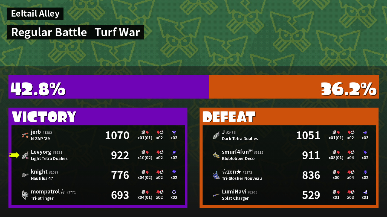 | Medals | #1 Overall Splatter #1 Enemy Splatter #1 Splat Assister | ||