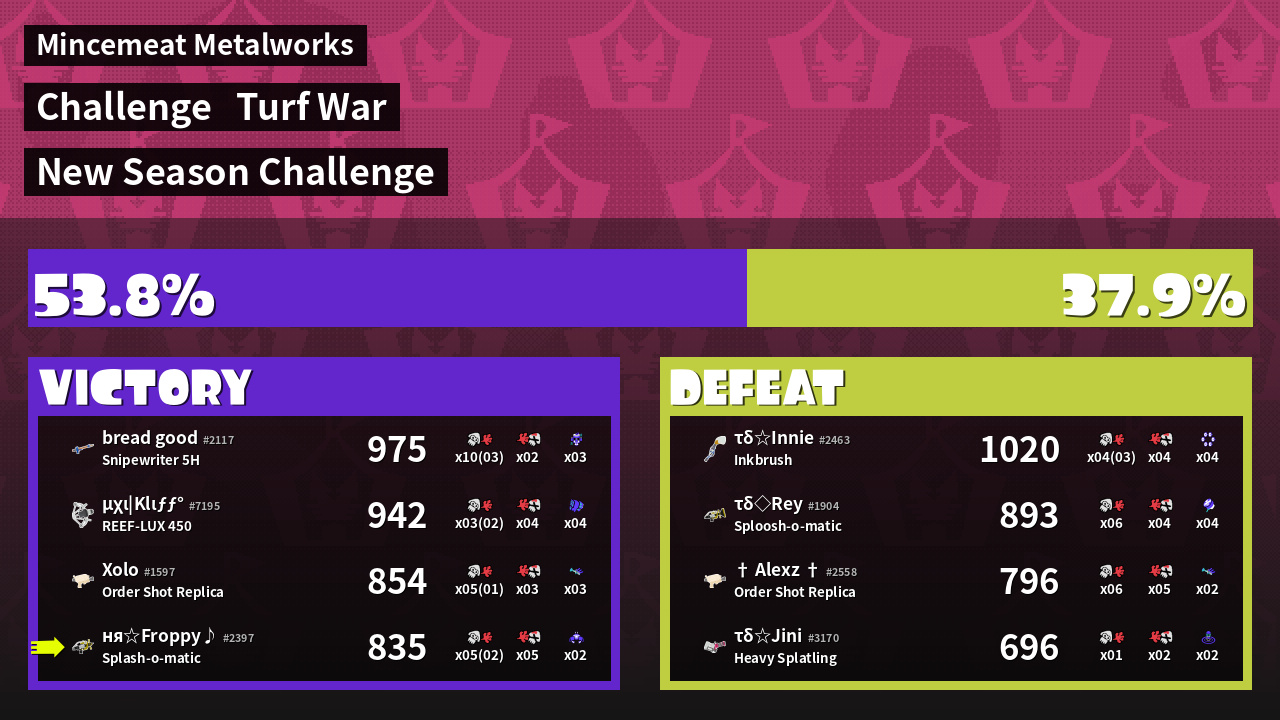 | Medals | #1 Damage Taker #1 Crab Tank User #2 Overall Splatter | ||