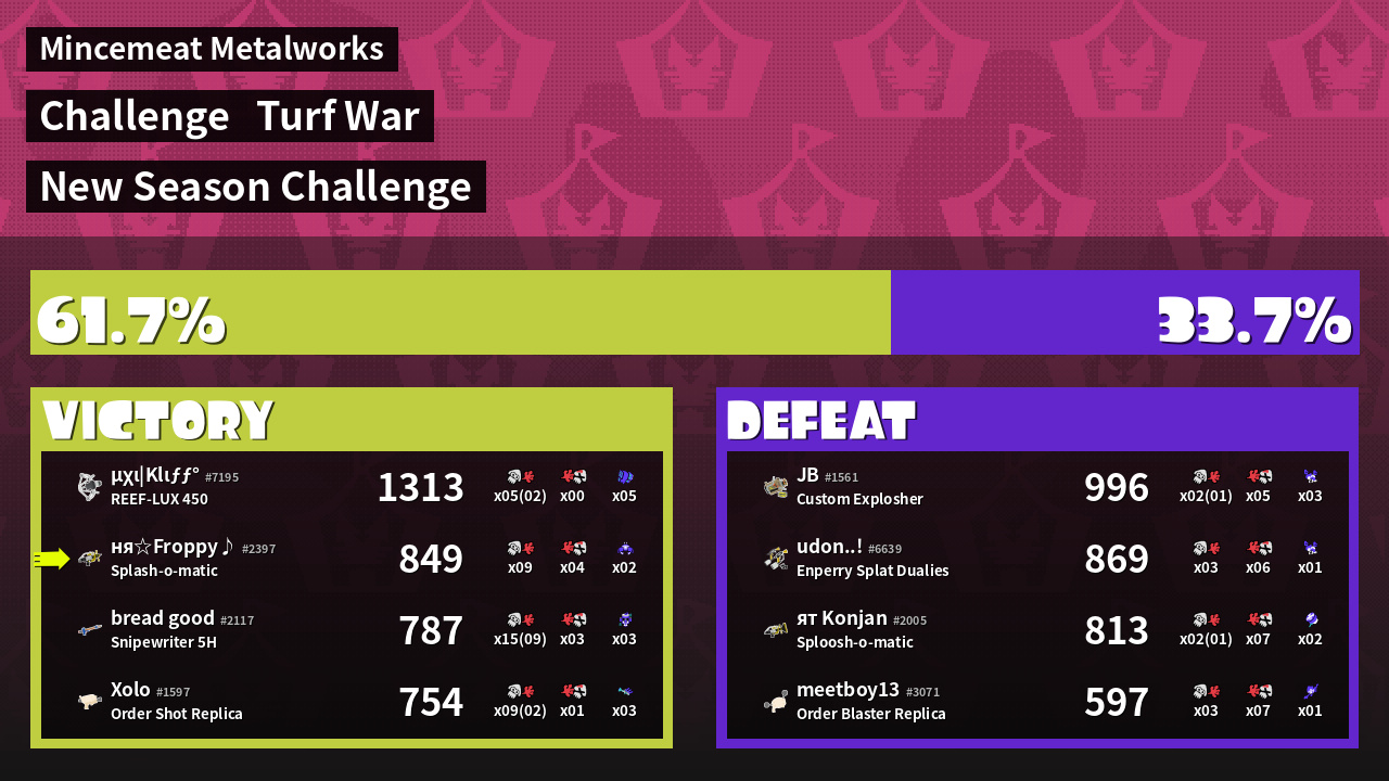 | A Real Streamer  ня☆Froppy♪ #2397 |  Splash-o-matic                    | 849 | 9 + 0 | 4 | 2.25 |  2 | |