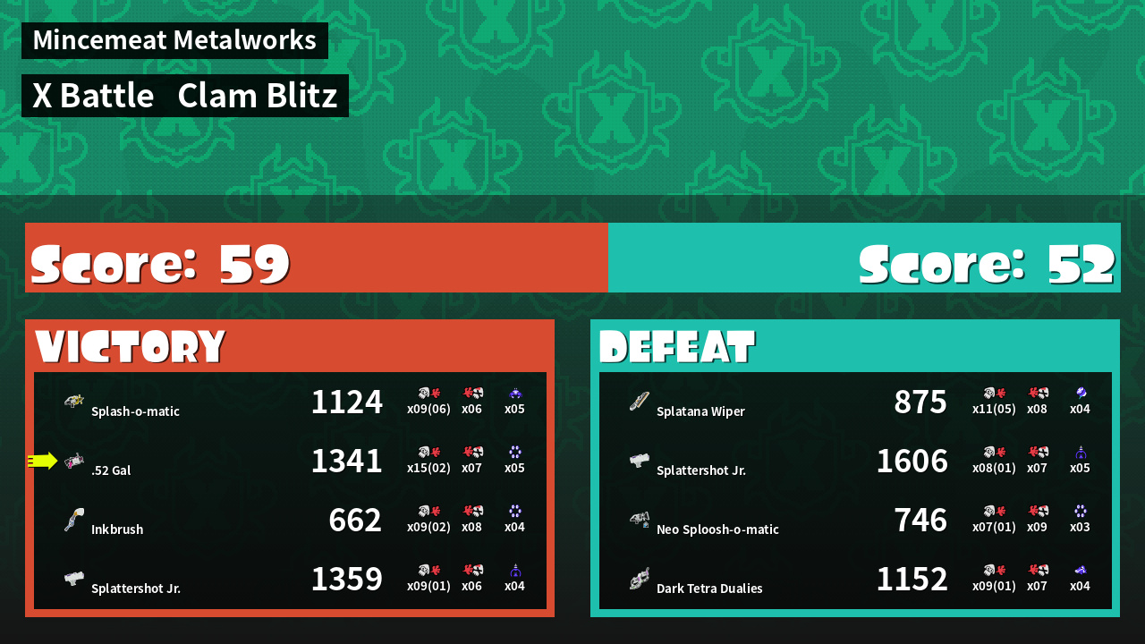 | Medals | #1 Overall Splatter #1 Enemy Splatter #1 Clam Stopper | ||
