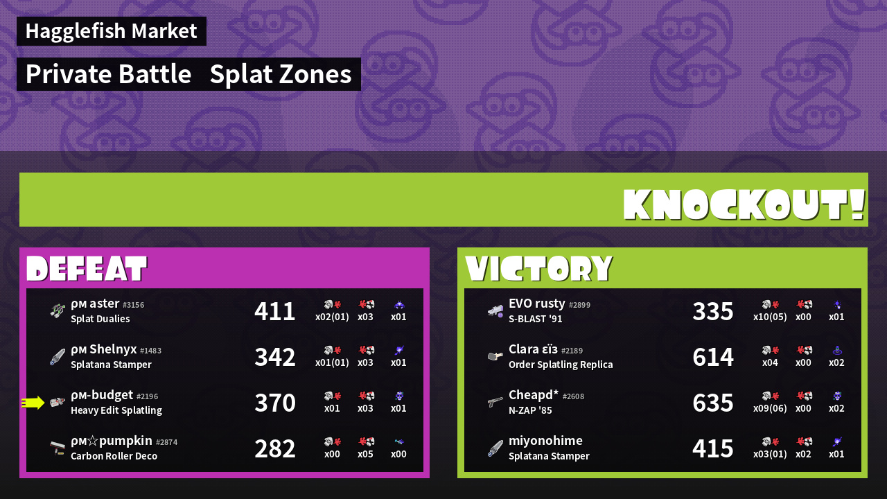| Mode | Splat Zones - Private Battle | ||