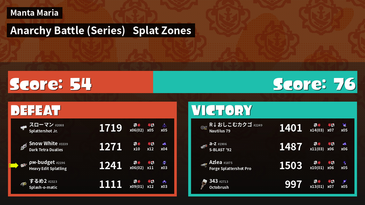 | Medals | #1 Splat Zone Guard #1 Splat Assister #1 Tacticooler User | ||