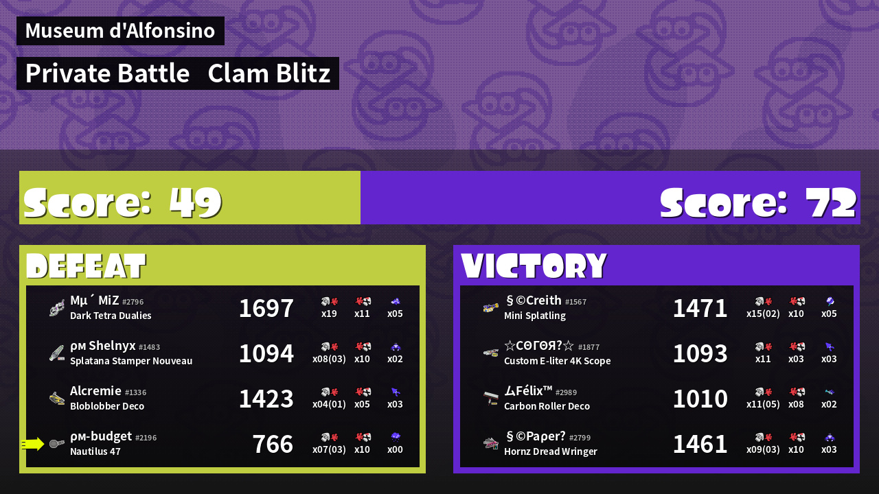 | Medals | #1 Splat Assister #2 Clam Carrier #2 Super Jump Spot | ||
