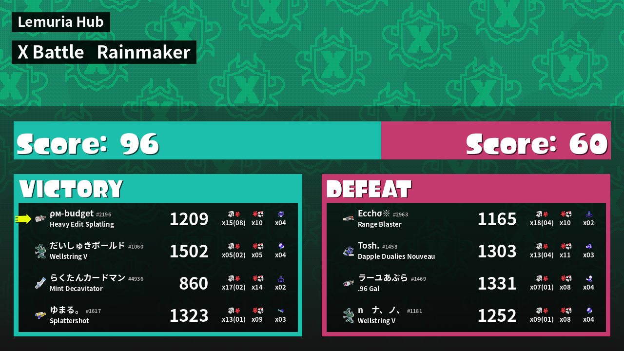 | Medals | #1 Score Booster #1 Popular Target #1 Splat Assister | ||