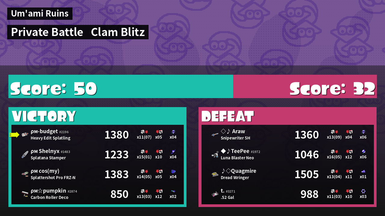 | Weapon |   Heavy Edit Splatling (  Curling Bomb /   Tacticooler) | ||