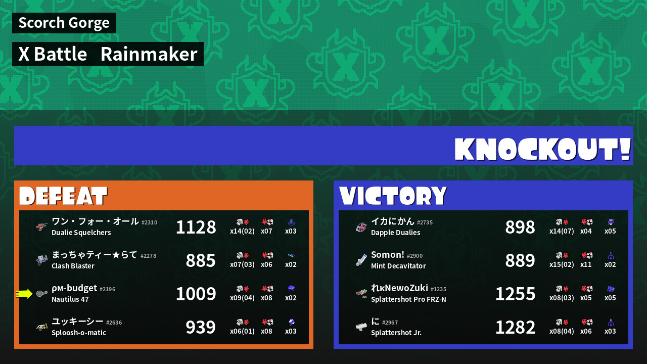 | Medals | #1 Splat Assister #1 Rainmaker Stopper #1 Ink Storm User | ||