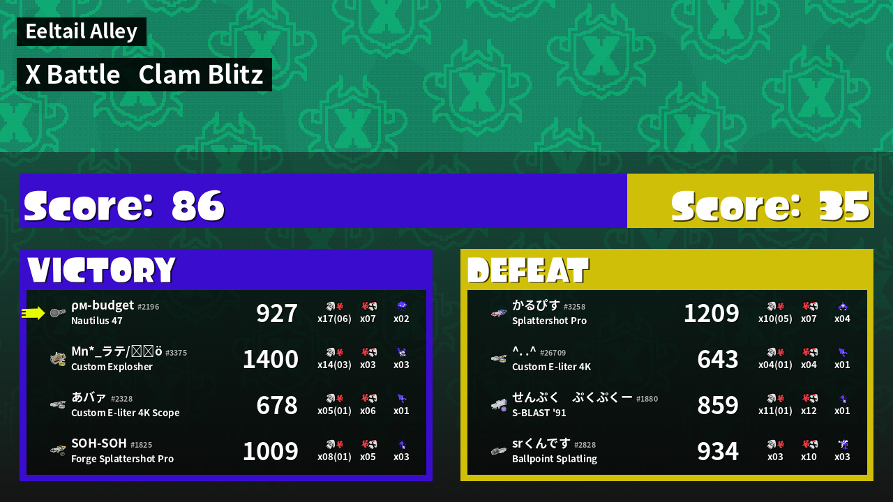 | Medals | #1 Overall Splatter #1 Clam Carrier #1 Enemy Splatter | ||