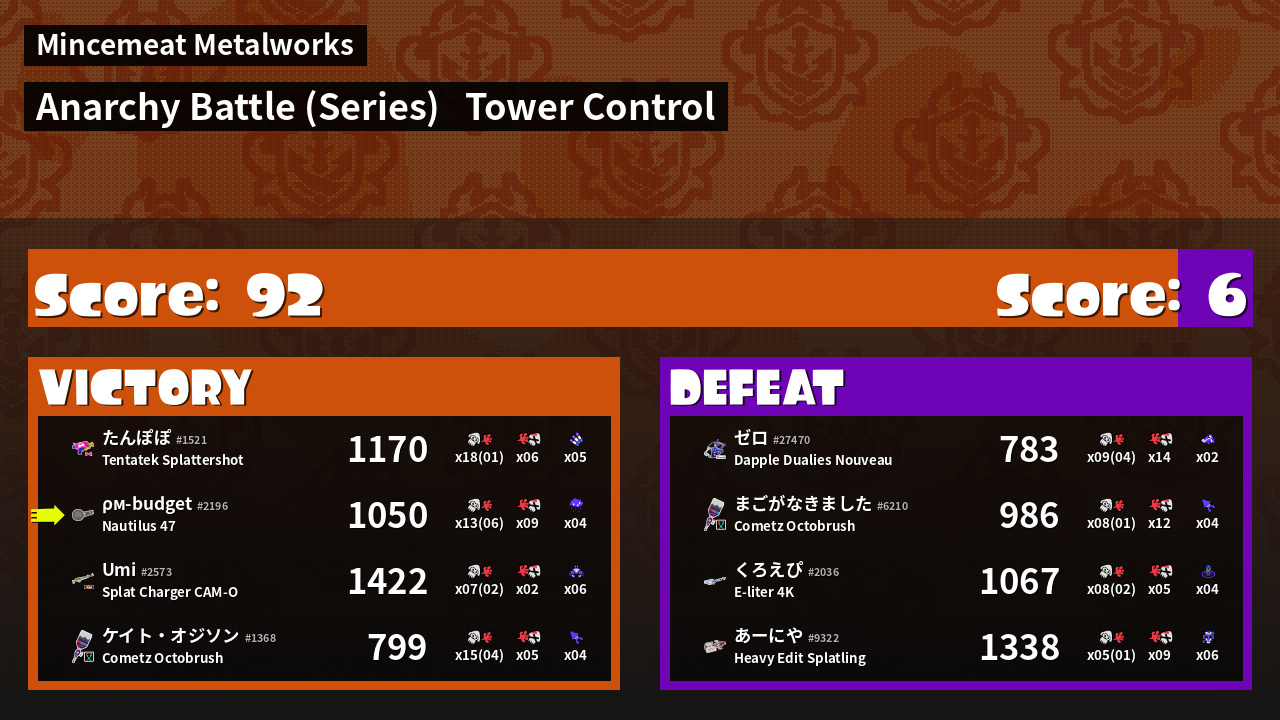 | Medals | #1 Score Booster #1 Splat Assister #1 Checkpoint Breaker | ||