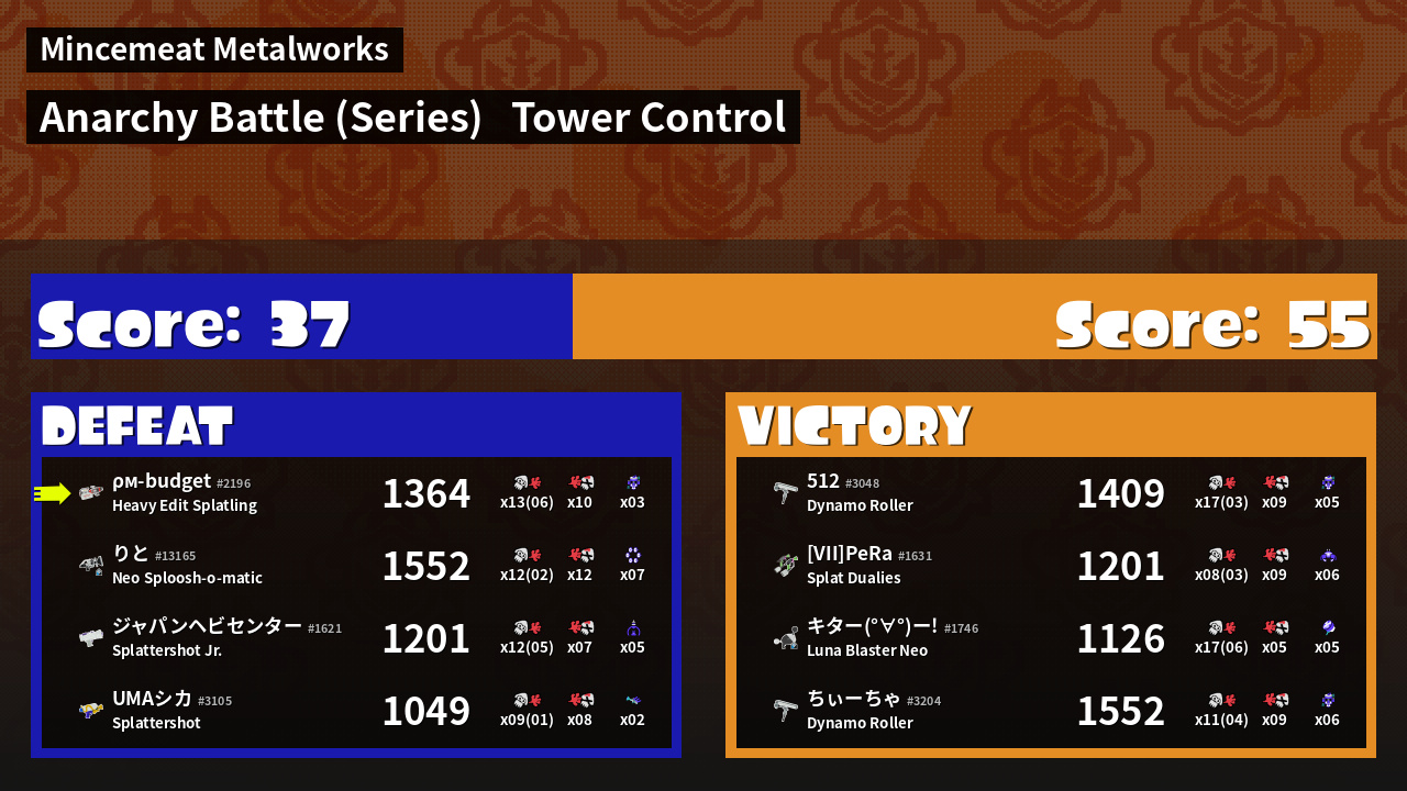 | Medals | #1 Overall Splatter #1 Score Booster Record-Score Setter | ||