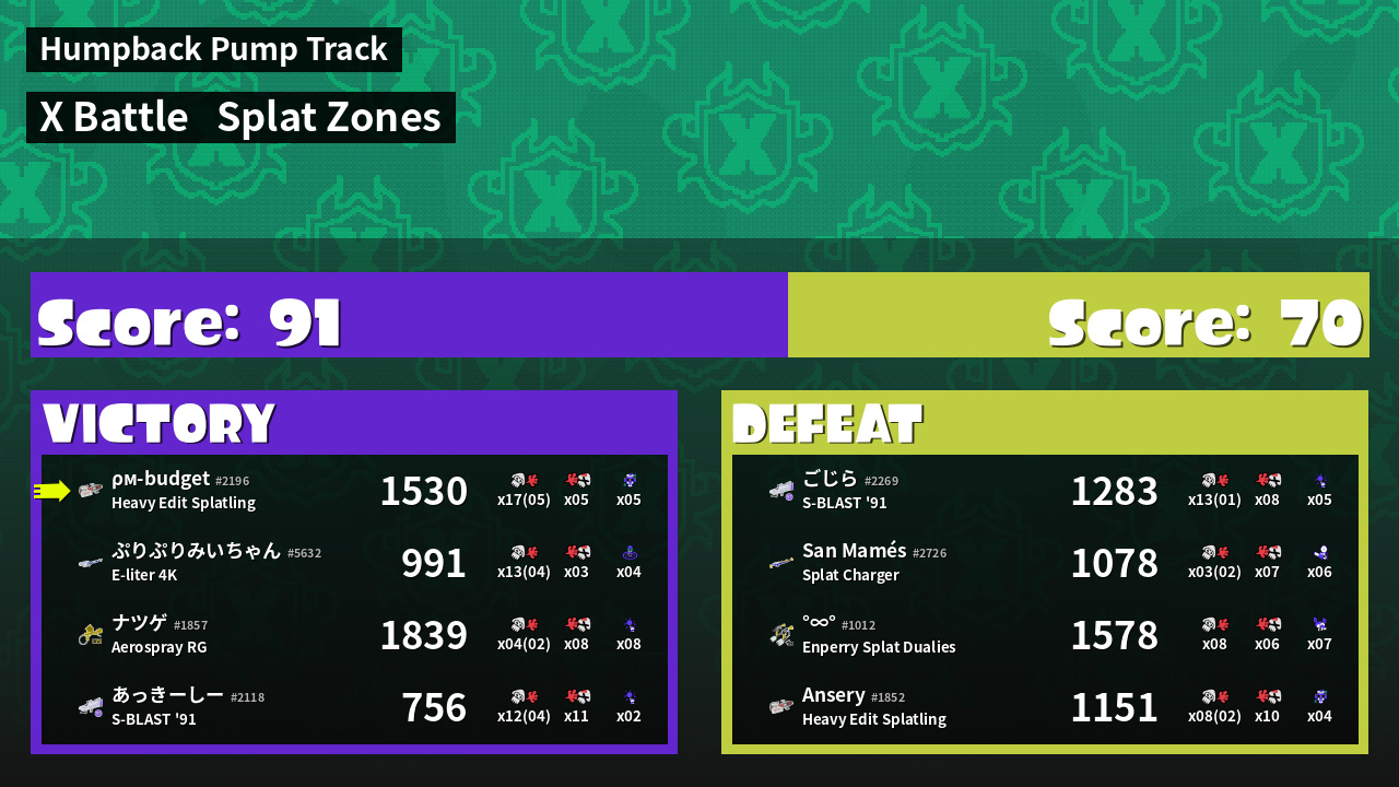 | Medals | #1 Overall Splatter #1 Splat Zone Guard #1 Enemy Splatter | ||