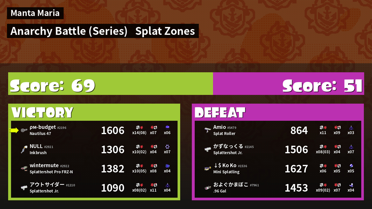 | Medals | #1 Overall Splatter #1 Splat Zone Inker #1 Splat Zone Guard | ||