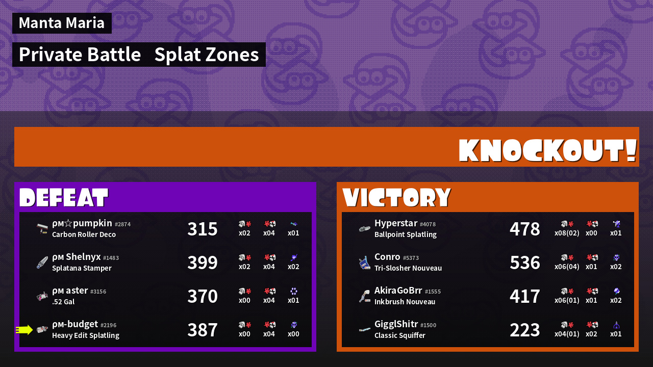 | Mode | Splat Zones - Private Battle | ||
