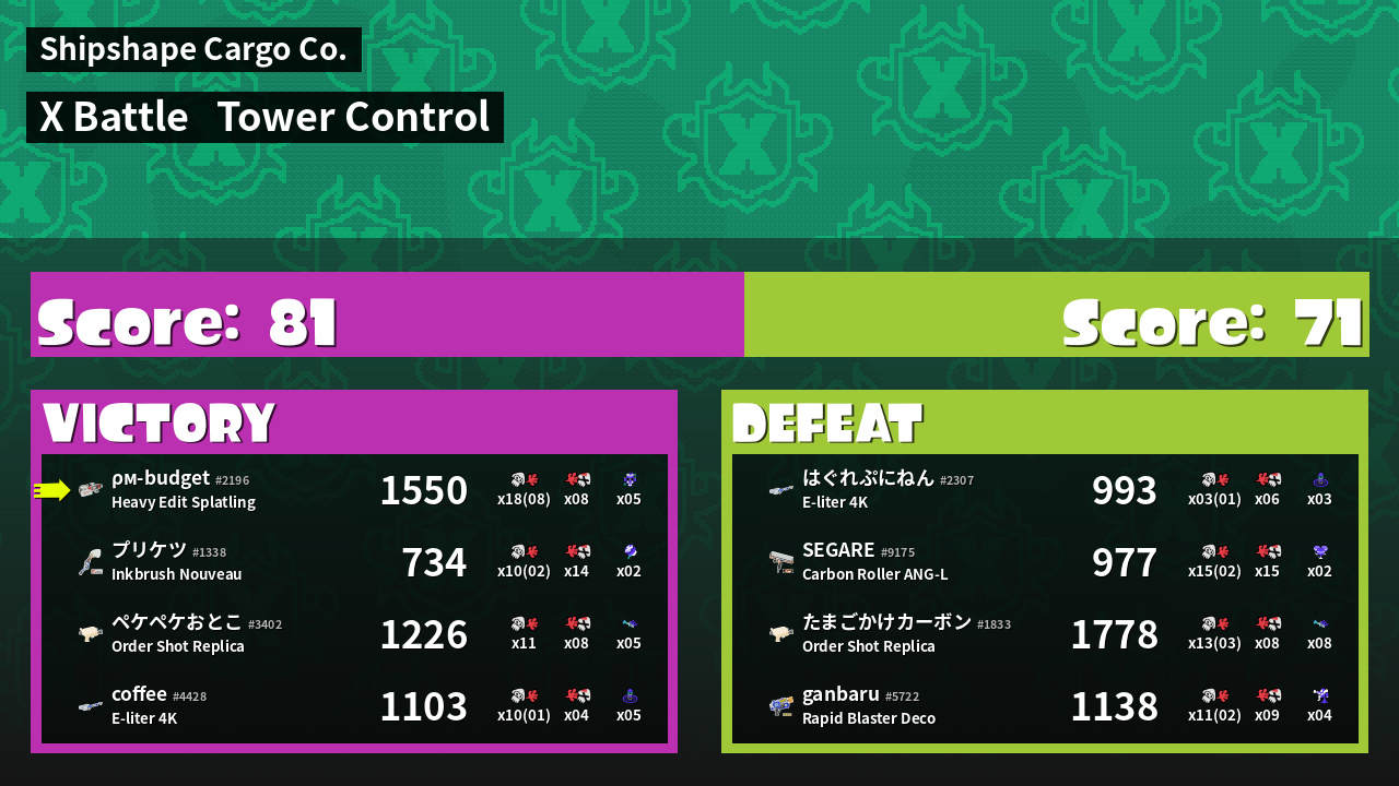 | Weapon | Heavy Edit Splatling ( Curling Bomb / Tacticooler) | ||