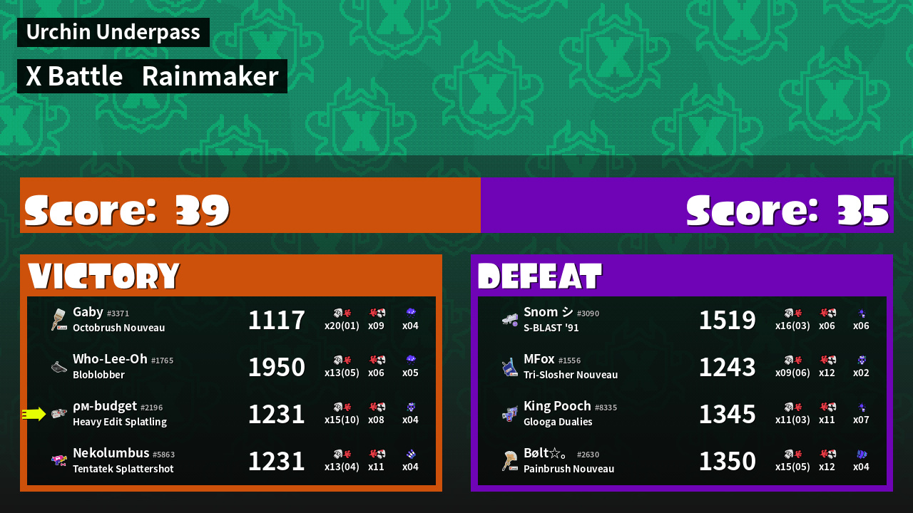 | Medals | #1 Splat Assister #1 Tacticooler User #2 Overall Splatter | ||