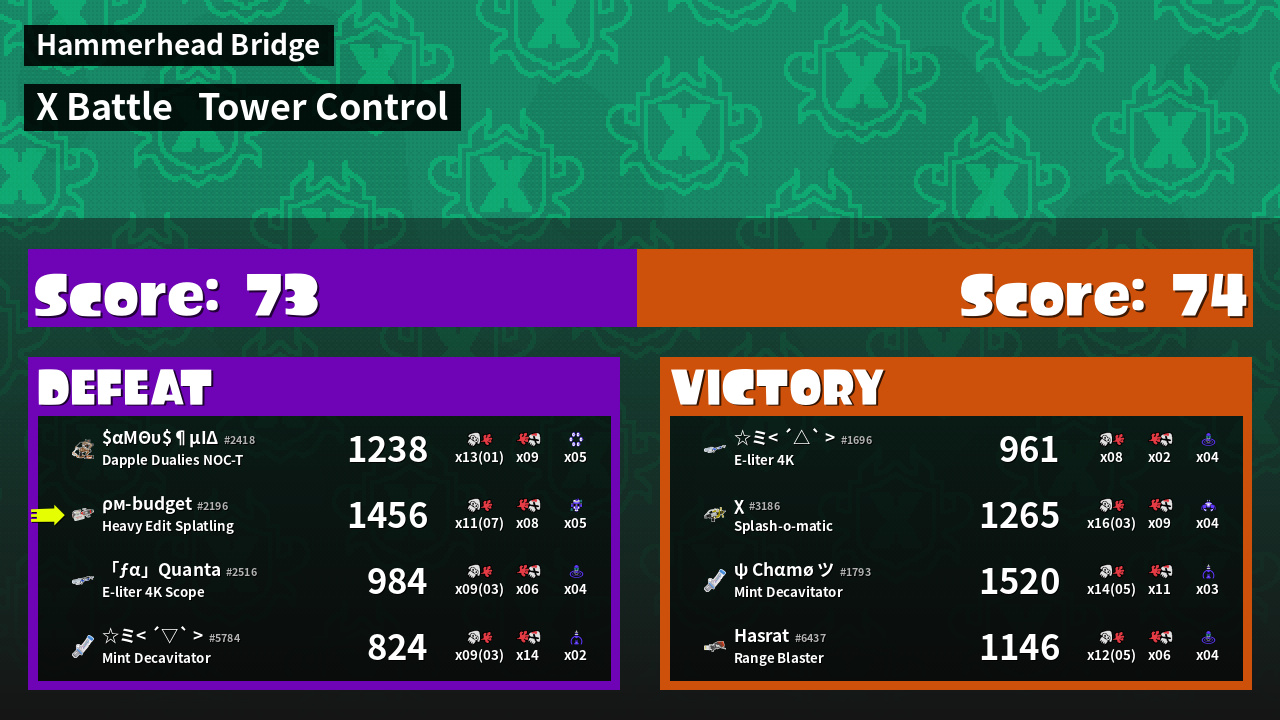| Medals | #1 Turf Inker #1 Splat Assister #1 Tower Stopper | ||