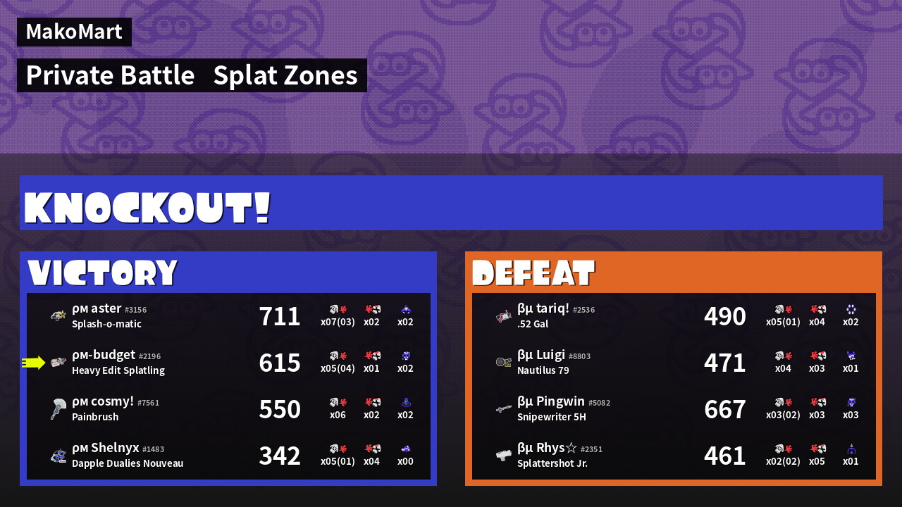 | Mode | Splat Zones - Private Battle | ||