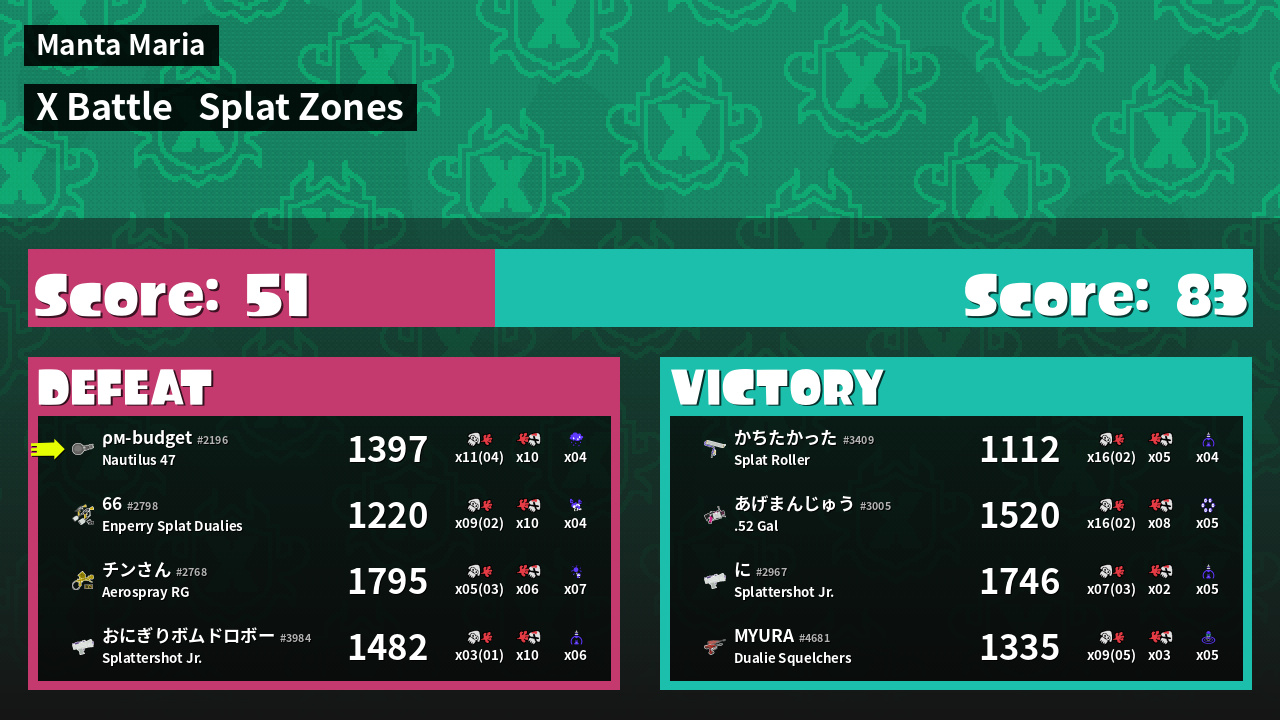 | Medals | #1 Overall Splatter #1 Splat Zone Inker #1 Splat Zone Guard | ||