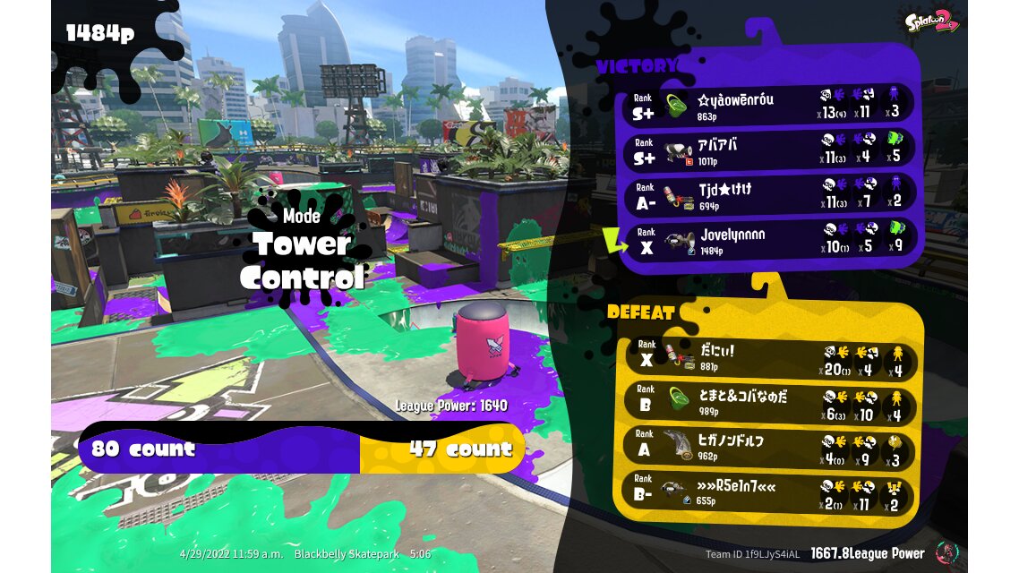 | Mode | Tower Control - League Battle (Quad) | ||||||||||||||||||||||