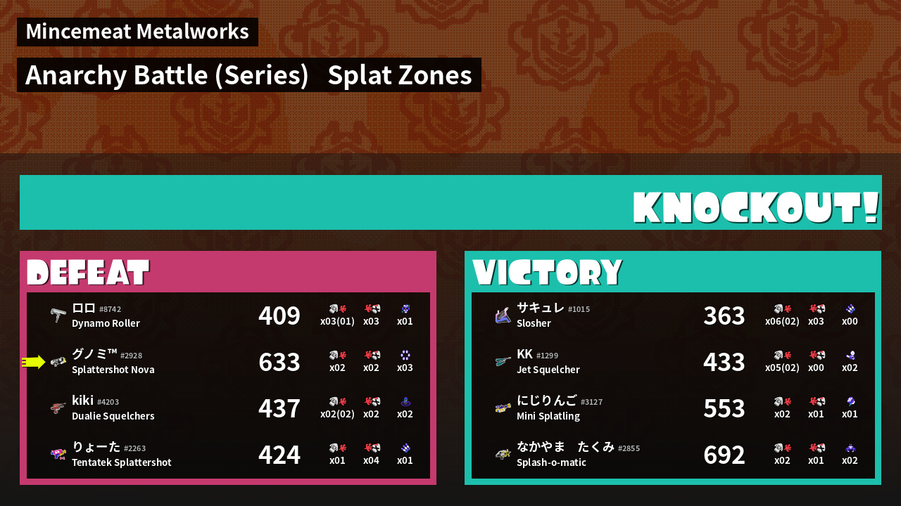 | Medals | #1 Turf Inker #1 Super Jump Spot #1 Enemy Splatter | ||