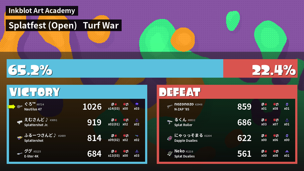 | Medals | #1 Overall Splatter #1 Turf Inker #1 Enemy-Base Inker | ||