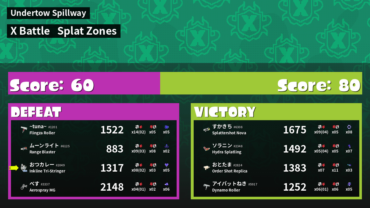 | 時代おくれの原始人  すかきち #6308 |  Splattershot Nova                    | M | 1,675 | 5 + 4 | 5 | 1.00 |  8 | |