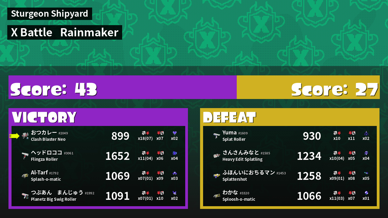 | Medals | #1 Overall Splatter #1 Enemy Splatter #1 Splat Assister |