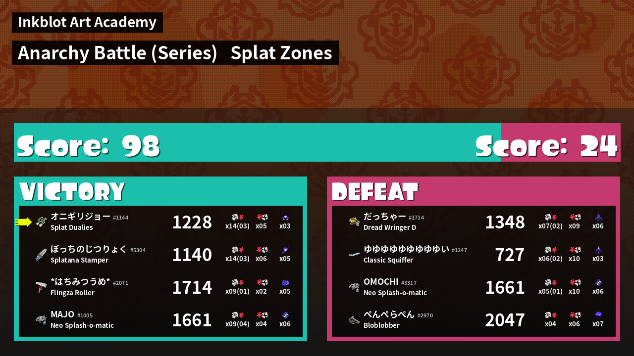 | Medals | #1 Overall Splatter #1 Splat Zone Guard #1 Enemy Splatter | ||