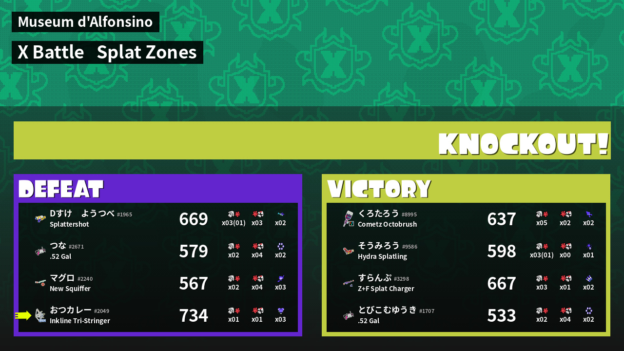 | バンカラな若者  Dすけ ようつべ #1965 |  Splattershot                    | S | 669 | 2 + 1 | 3 | 0.67 |  2 | |
