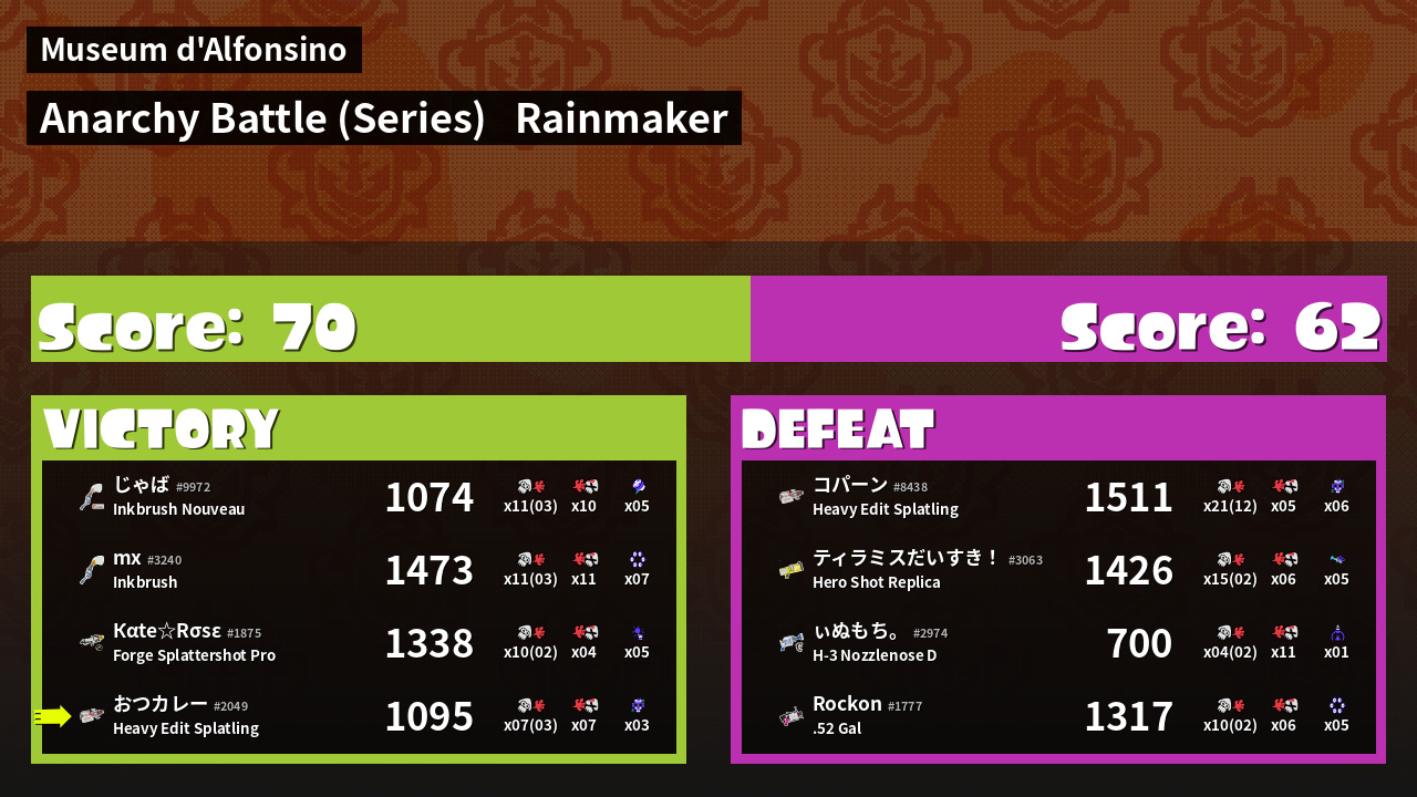 | Medals | #1 Super Jump Spot #1 Splat Assister #1 Checkpoint Breaker |
