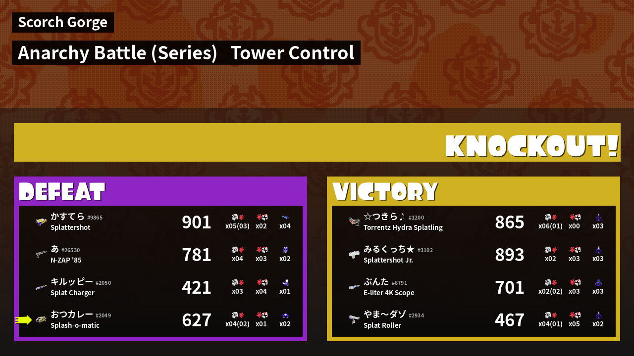 | Medals | #1 Tower Stopper #2 Overall Splatter #2 Splat Assister |