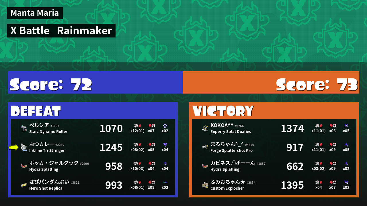 | Weapon | Inkline Tri-Stringer ( Sprinkler / Super Chump) |