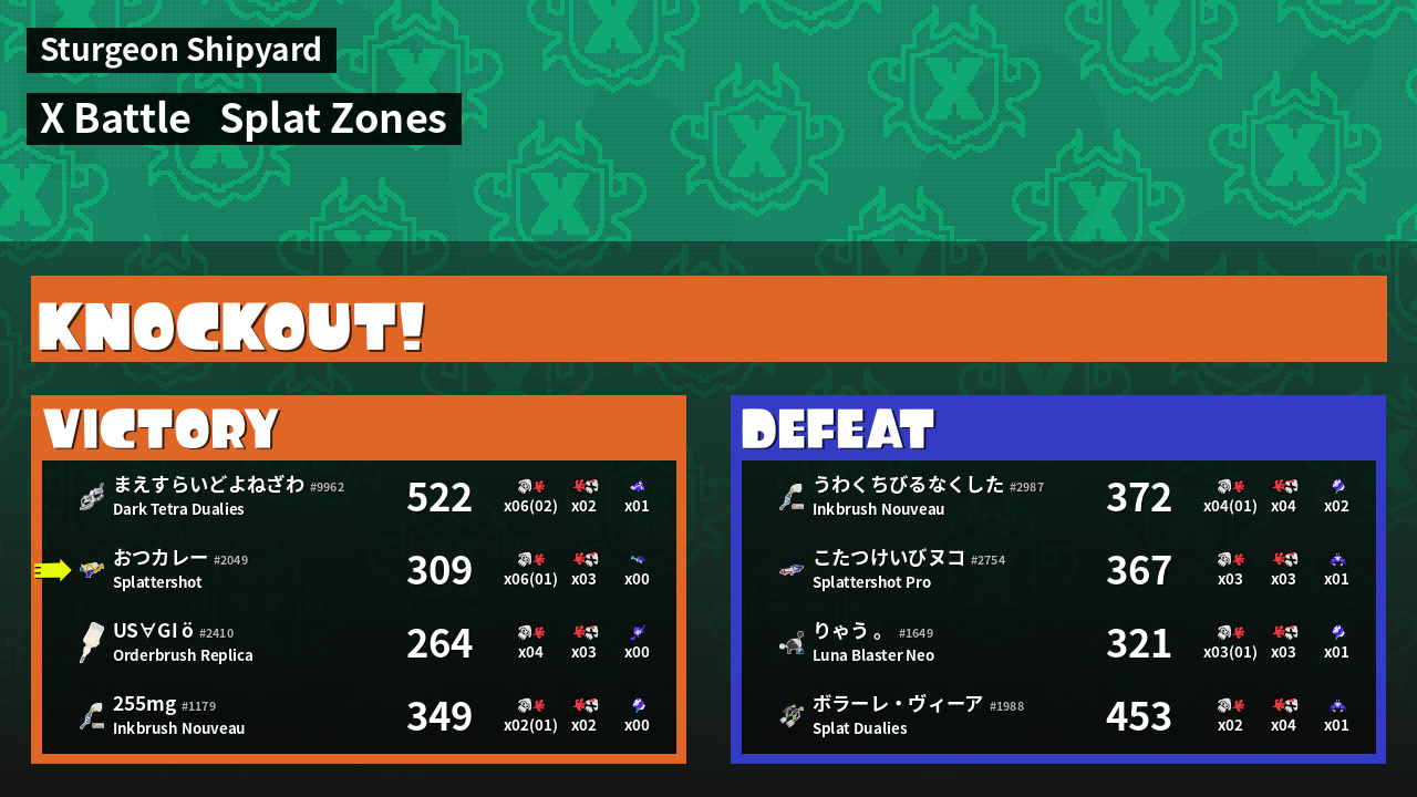 | Medals | #1 Overall Splatter #1 Splat Zone Guard #1 Enemy Splatter |
