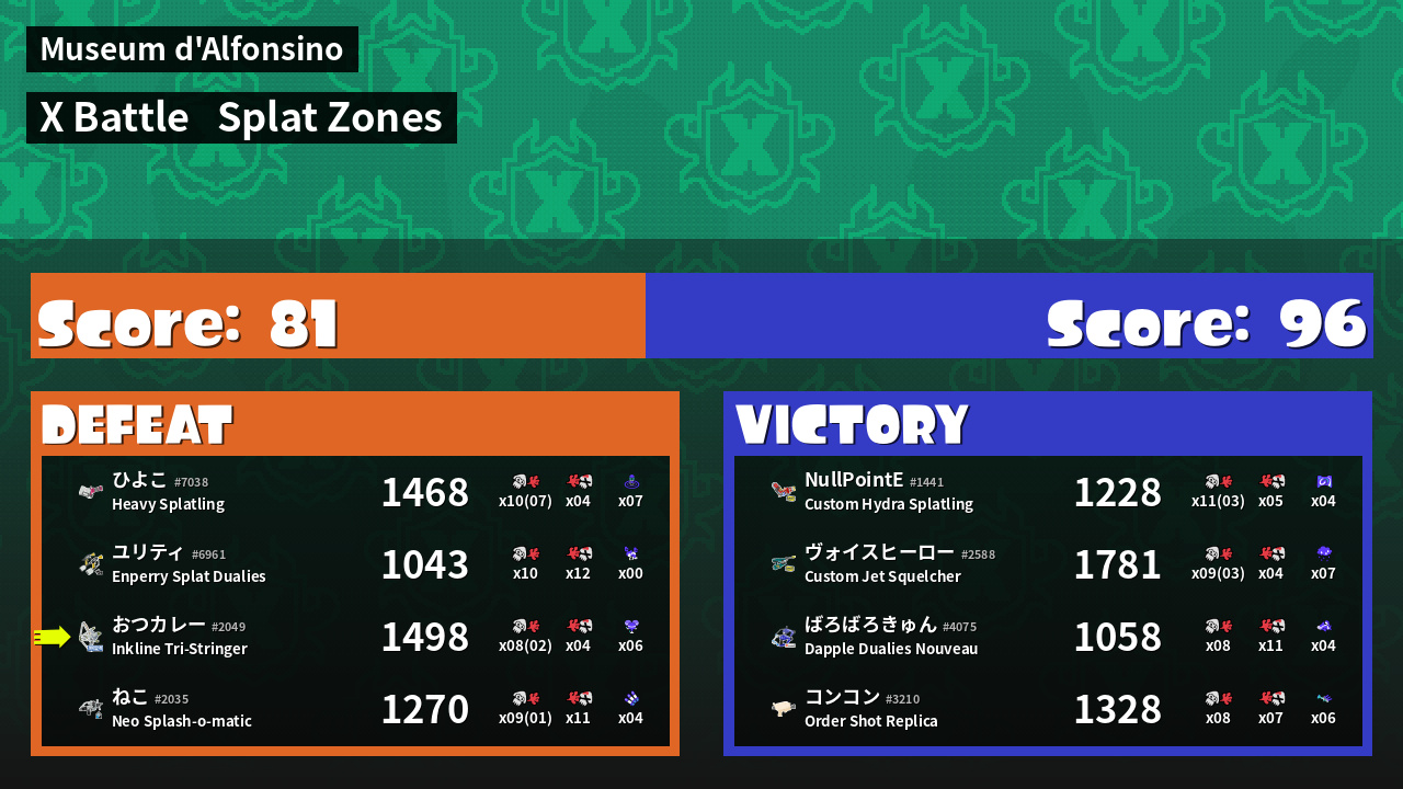 | 熟成したおねえさん  NullPointE #1441 |  Custom Hydra Splatling                    | L | 1,228 | 8 + 3 | 5 | 1.60 |  4 | |