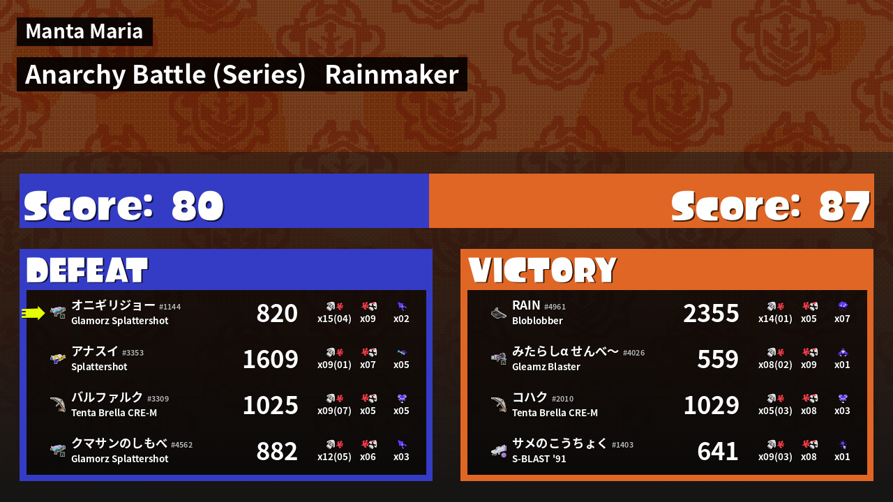 | Weapon | Glamorz Splattershot ( Burst Bomb / Kraken Royale) |