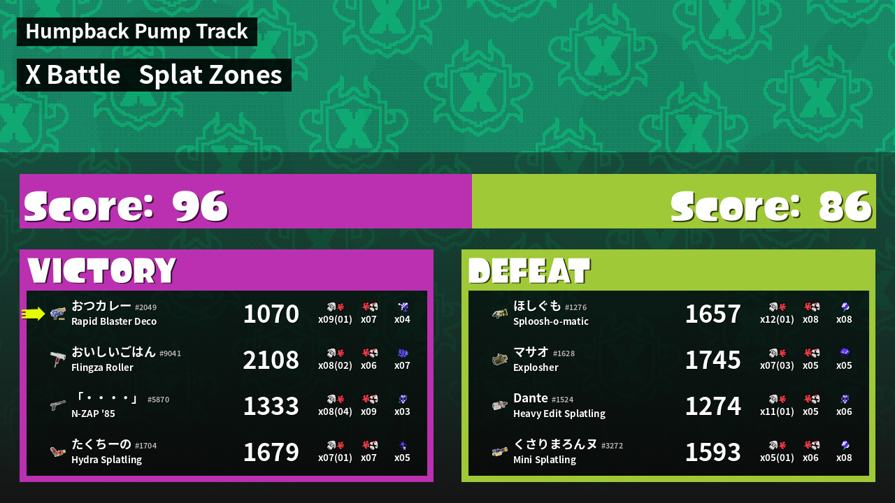 | Medals | #1 Overall Splatter #1 Splat Zone Guard #1 Super Jump Spot |