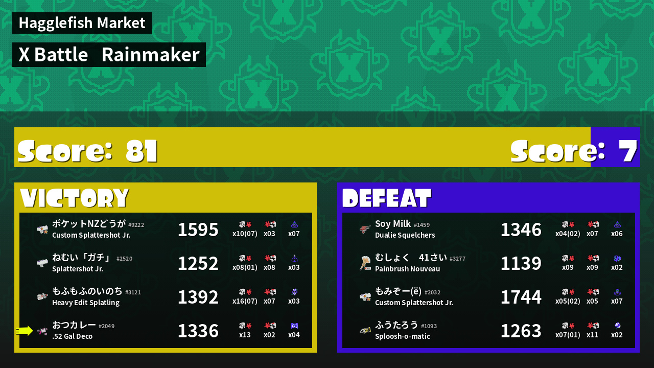 | Weapon | .52 Gal Deco ( Curling Bomb / Splattercolor Screen) |