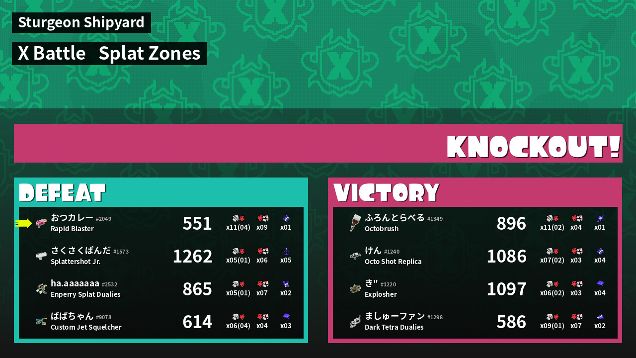 | Medals | #1 Overall Splatter #1 Splat Zone Guard #1 Enemy Splatter |