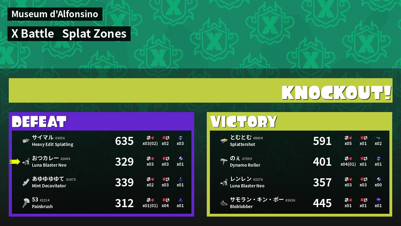 | DJDJ  サイマル #3056 |  Heavy Edit Splatling                    | M | 635 | 1 + 2 | 2 | 0.50 |  3 | |