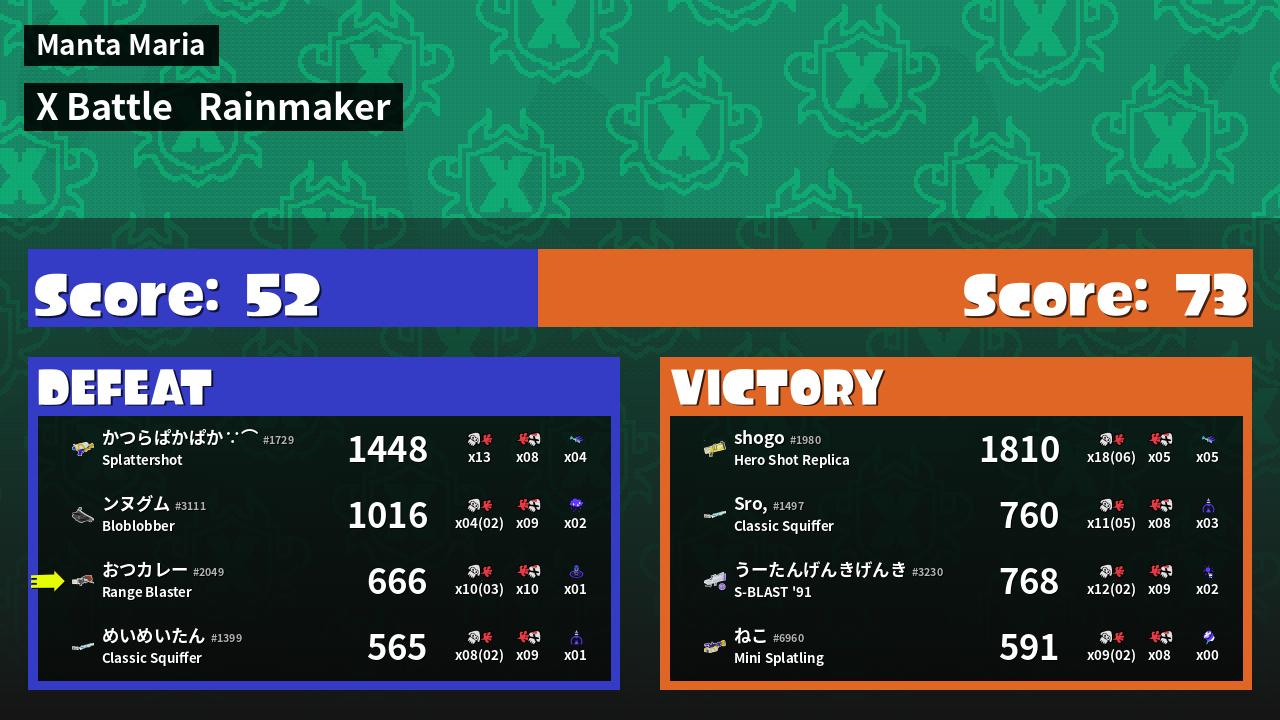| Medals | #1 Splat Assister #1 Rainmaker Stopper #1 Damage Taker |
