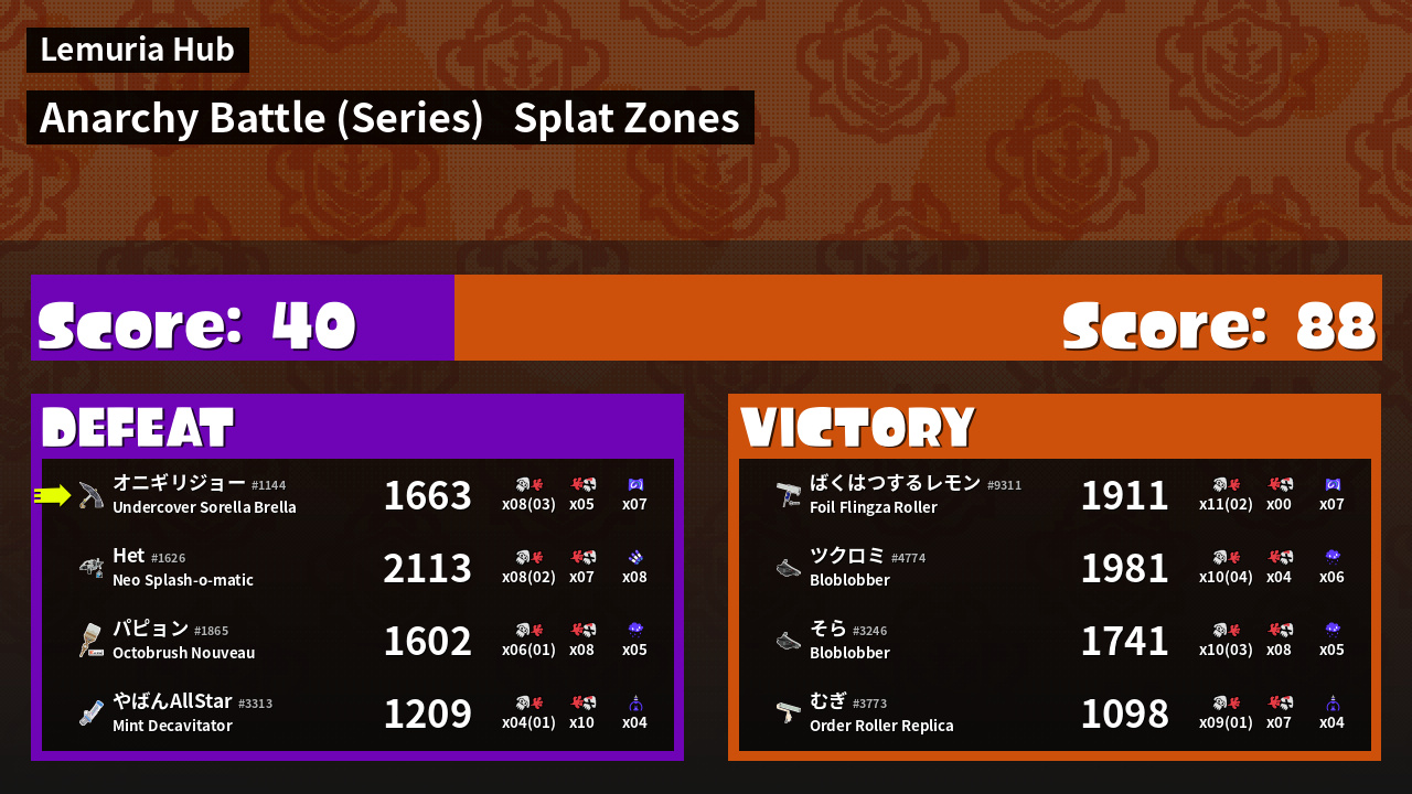 | Medals | #1 Overall Splatter #1 Splat Zone Guard #1 Splat Assister | ||