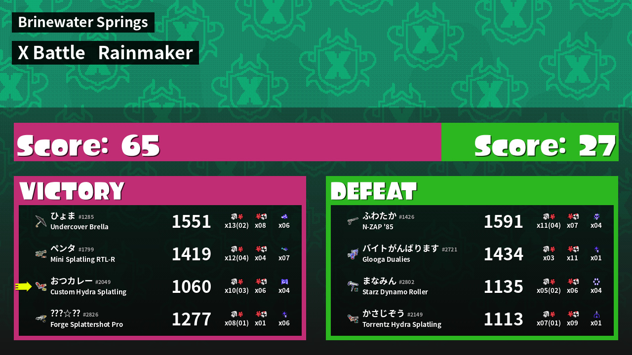 | Weapon | Custom Hydra Splatling ( Ink Mine / Splattercolor Screen) |