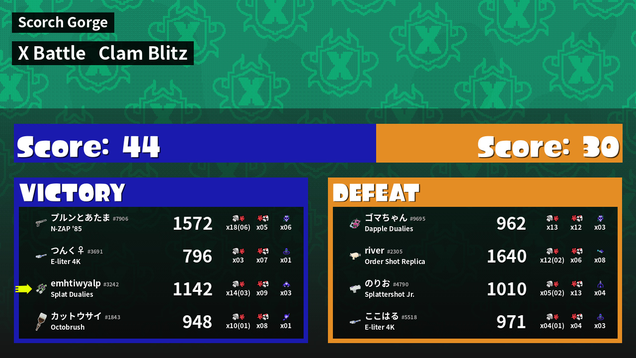 | Medals | #1 Damage Taker #1 Crab Tank User #2 Overall Splatter | ||